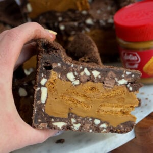 Melt the biscoff spread for 20 seconds in the microave to loosen slightly or mix in a bowl briefly to loosen. Pour half into the cake tin inside the cookie dough case!