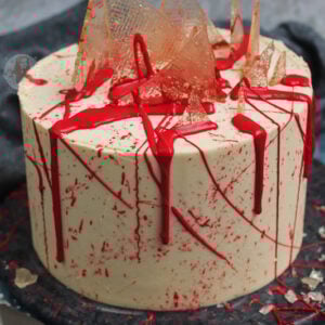 Carefully 'splatter' the blood coloured ganache using a pastry brush and flicking it towards the cake... this bit can be messy.