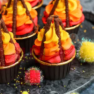 Pipe a ring of red food colouring onto each cupcake. Then, pipe a slightly smaller orange ring, and then finally a little yellow one on top. I used a 2d closed star piping tip.