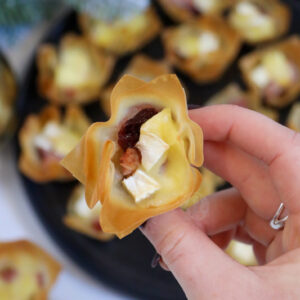 Delicious easy bitesize brie and bacon bites with cranberry and filo pastry cases - delicious snack for the festive season!