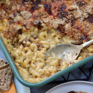 Pour the pasta into a medium sized baking dish, and pour over the sauce. Stir together to combine