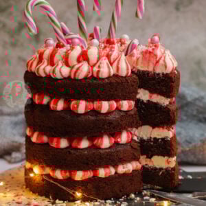 On the final layer, add some extra buttercream, and add some sprinkles and candy canes.