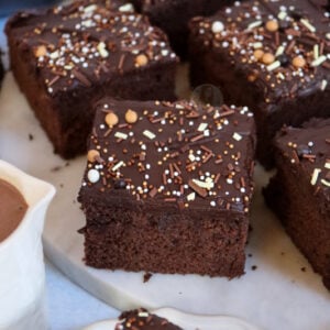 A deliciously yummy chocolate school cake with a really easy-to-make chocolate cake, icing, and homemade chocolate custard!