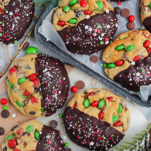 Add in the milk chocolate chips, dark chocolate chips and M&Ms and beat until they're distributed well!