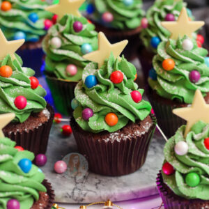 Pipe green food colouring on to each cupcake using a 2d closed star piping nozzle - try to keep some of the cupcake sponge exposed, and pipe the buttercream taller than usual.