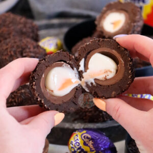 Delicious showstopping Creme Egg scotch eggs with a Creme Egg wrapped in homemade chocolate brownie and sprinkles!