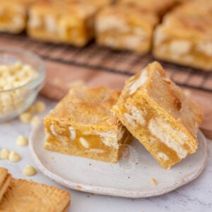 Bake the custard cream blondies in the oven for 25-30 minutes, or until there is a slight wobble in the middle. (See notes below)