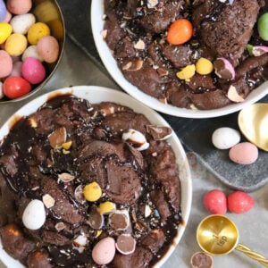 Super chocolatey easter cookie dough desserts with a chocolate mini egg stuffed cookie dough, perfect with ice cream and chocolate sauce to serve!