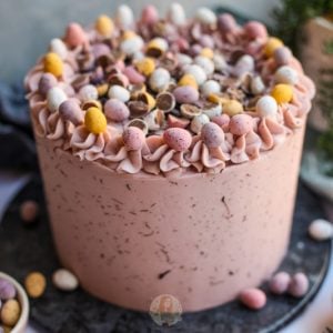 Decorate the top of the cake with any left over buttercream, and some mini eggs.
