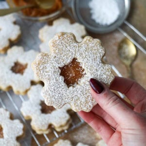 You’ll need to cut a smaller snowflake or circle out of the centre of half of the biscuits you create to make the sandwiches