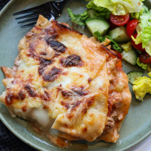 Assemble the lasagne by spreading one third of the bolognese on the bottom of the baking dish, adding a layer of lasagna sheets, and then pouring over a third of the cheese sauce.