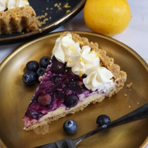 A creamy lemon blueberry tart with a biscuit base, lemon filling with a blueberry coulis swirl and whipped cream on top - perfect summer bake.