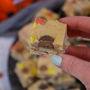 Top with the rest of the peanut butter cups and reese's pieces and gently push them into the fudge. Leave to set in the fridge for 2-3+ hours.