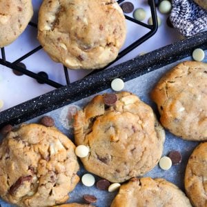 Add 6 cookies to each tray and then bake in the oven for 11-13 minutes, or until golden.