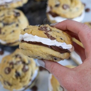 Pipe the chocolate spread onto half of the cookies, and then pipe the marshmallow on top.