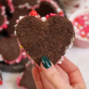Delicious valentines sandwich cookies with a soft chocolate cookie, silky smooth frosting with sprinkles, perfect for Valentine's Day!