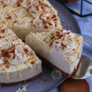 A delicious white chocolate and ginger cheesecake with a ginger nut biscuit base, a creamy white chocolate cheesecake filling studded with crystallised ginger and more!